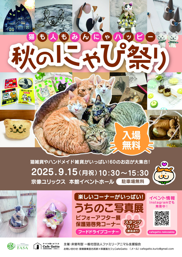 2025年9月15日(月・祝)10:30~15:30、宗像ユリックス 本館イベントホール(宗像市久原400)にて「秋のにゃぴ祭り」が開催されます。入場無料。