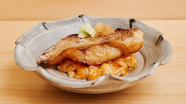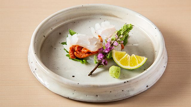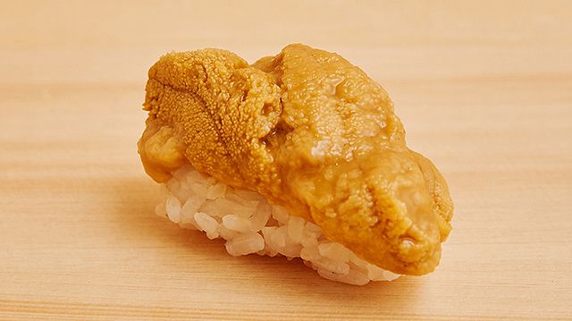 振る舞うのは「おまかせコース」のみ。コースの始まりは、心を解きほぐす、濃厚なシジミのスープから。その後、尾道名産ネブトの素揚げ、梅干をのせた茶碗蒸し、青森産ムラサキウニと北海道産バフンウニをアオリイカで巻いた2種類のウニ食べ比べなど…ウィットの効いたつまみが続き、お待ちかねの伝統かつ正統な江戸前握りが登場。大トロの筋部分に自家製塩をまぶした独自の味わい方も「鮨まつもと」ならではの魅力。