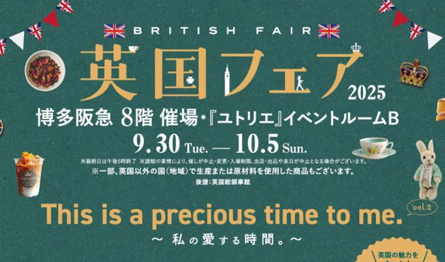 2025年9月30日(火)~10月5日(日)10:00~20:00(最終日は午後5時終了)、博多阪急(福岡市博多区博多駅中央街1-1)8階 催場・『ユトリエ』イベントルームBにて、「英国フェア2025」が開催されます。