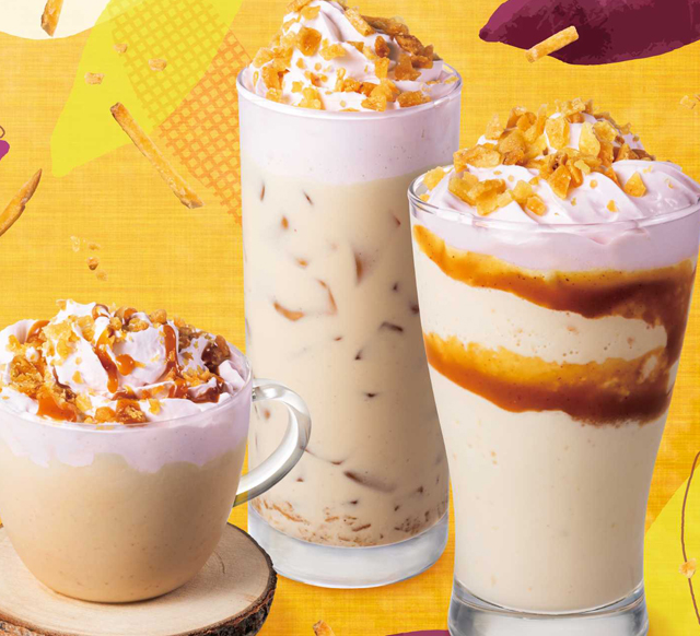 トップには、カリッとした食感が楽しい芋けんぴフレークをトッピングし、見た目でも秋らしさを演出。メニューはホット・アイス・フローズンの3種類をラインアップ。香ばしい焼き芋の風味とともに秋の訪れをお楽しみください。