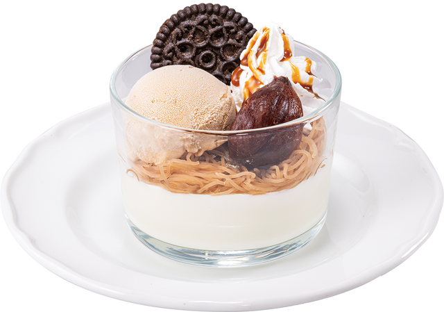 マロングラッセが練り込まれたマロンジェラートと、渋皮栗、マロンペーストを使用した、栗づくしの一品です。北海道産マスカルポーネ入りのパンナコッタはミルキーな味わいで、濃厚なマロンペーストやマロンジェラート、ビターキャラメルソースと好相性。食後にぴったりなサイズのグラスドルチェです。