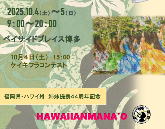 2025年10月4日(土)~10月5日(日)9:00~20:00、ベイサイドプレイス博多(福岡市博多区築港本町13番6号)海側イベントスペース 特設会場にて、「ハワイアンフェスティバル in 福岡2025」が開催されます。入場無料。