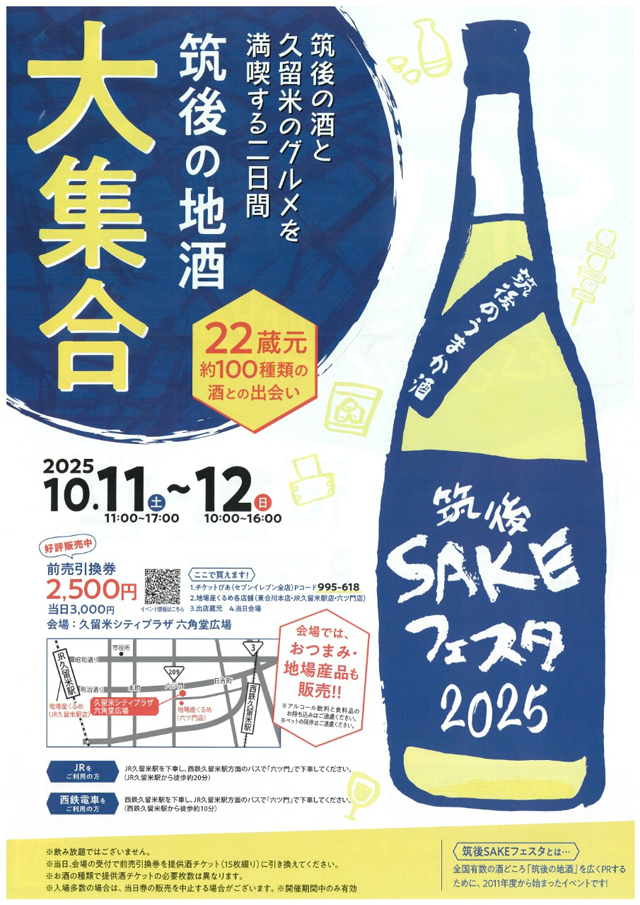 2025年10月11日(土)11:00~17:00、10月12日(日)10:00~16:00、久留米シティプラザ六角堂広場(久留米市六ツ門町8-1)にて、「筑後SAKEフェスタ2025」が開催されます。