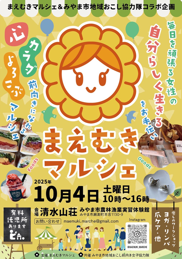 2025年10月4日(土)10時~16時、清水山荘(みやま市瀬高町本吉1130-9/みやま市農林漁業実習体験館)にて、「まえむきマルシェ」が開催されます。