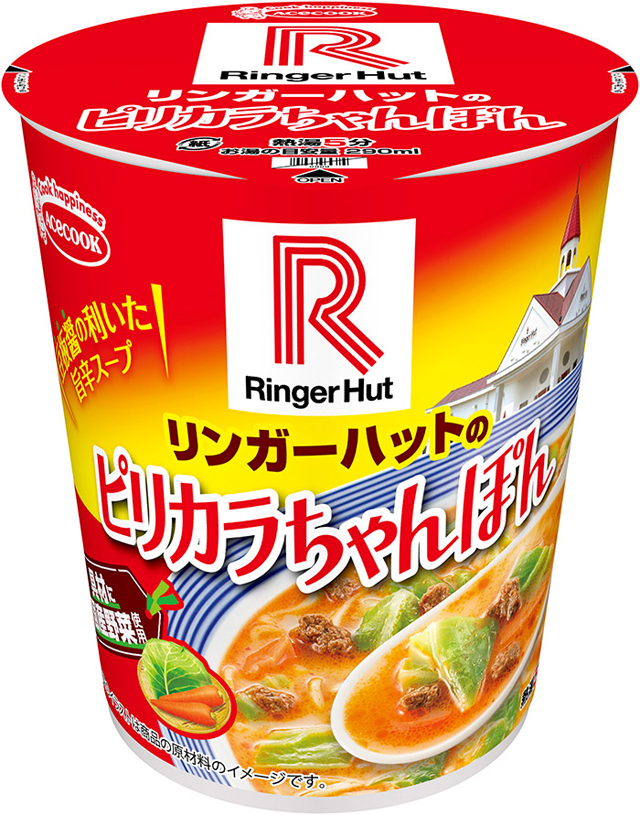 とんこつ風味のちゃんぽんスープや国産野菜の使用にこだわり、リンガーハットの看板メニュー「長崎ちゃんぽん」と、大人気メニューの「ピリカラちゃんぽん」の味わいを再現。