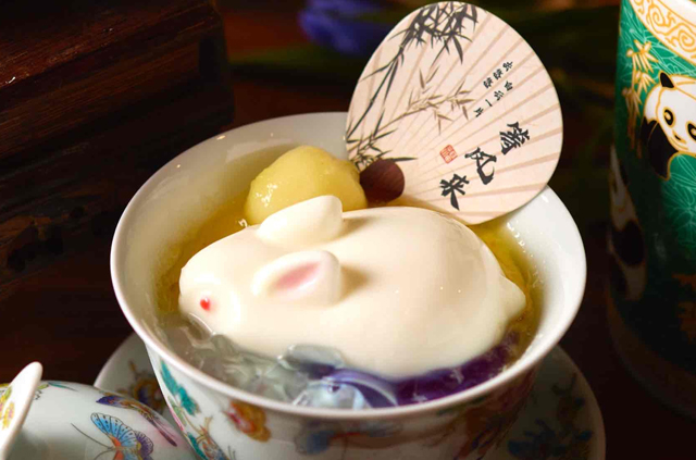 蓋碗うさぎ杏仁豆腐は夜空をモチーフにした白涼粉ゼリー、月をイメージした手作り白玉、月明かりをイメージした徳島県産の木頭柚子と桂花をトッピングしています。