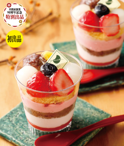 スポンジに苺のクリーム、ラズベリークリームを重ねたベリーづくしのパフェに粒あんや白玉を飾りました。