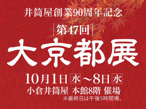 2025年10月1日(水)~10月8日(水)10:00~19:00(最終日は17:00まで)、小倉井筒屋(北九州市小倉北区船場町1-1)本館8階催場にて、井筒屋創業90周年記念「第47回 大京都展」が開催されます。