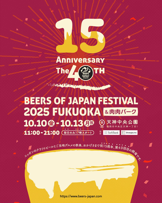 2025年10月10日(金)~10月13日(月・祝)11:00~21:00(初日は17:00~)、天神中央公園(福岡市中央区天神1-1)にて「BEERS OF JAPAN FESTIVAL 2025福岡 & 肉肉パーク」が開催されます。