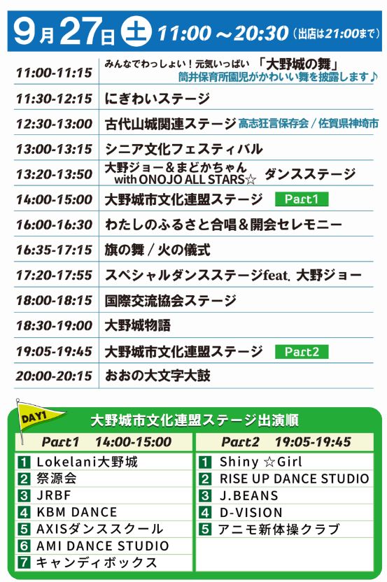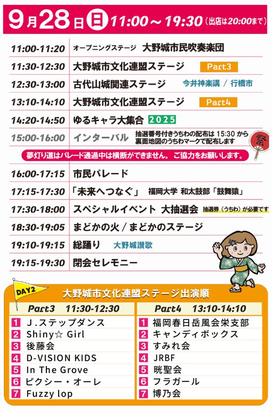 大野城市PRキャラクター「大野ジョー」や大野城市イメージキャラクター「まどかちゃん」によるキャラクタショーや各団体によるステージ、市民パレードなど2日間を通して見どころ満載のステージをおこないます。