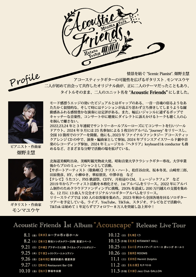 2025年10月26日(日)福岡市中央区大名のROOMSにて、ピアニスト・畑野圭慧さんとギタリスト・モンマユウヤさんによるデュオ“Acoustic Friends”の 1st アルバム「Acouscape」の発売を記念したライブが開催されます。