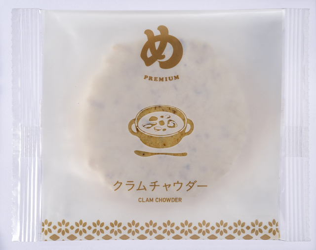 今回の「プレミアムめんべい クラムチャウダー」は実際のクラムチャウダーと同じ素材を練り込んでおり、めんべいの表面に見えるあさりやオニオンは、まさに「具だくさんスープ(=チャウダー)」の証。