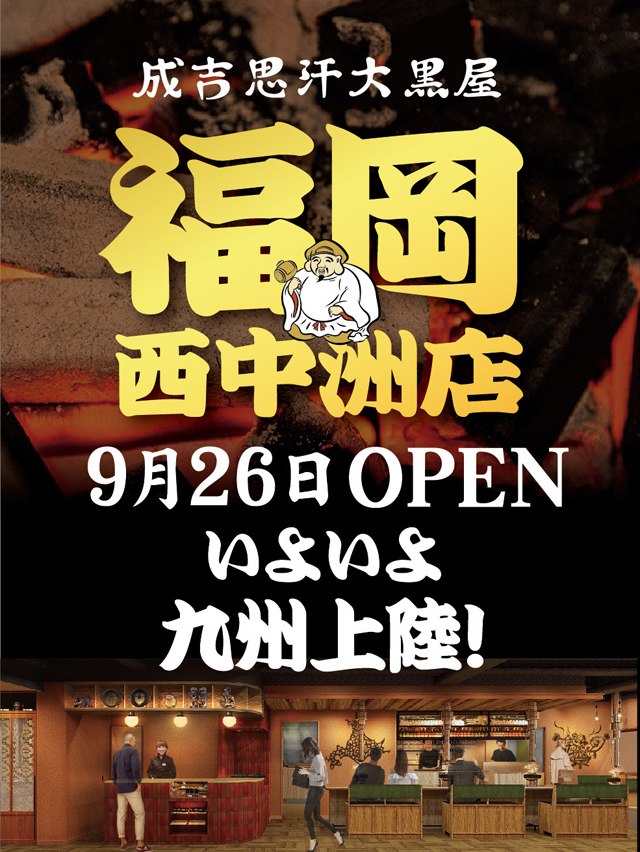 2025年9月26日(金)旭川発ジンギスカン「旭川成吉思汗 大黒屋 西中洲店」(福岡市中央区西中洲1-2)がオープンしました。九州初上陸。営業時間は平日16:00~23:00(LO22:30)、土日祝11:00~23:00(LO22:30)。