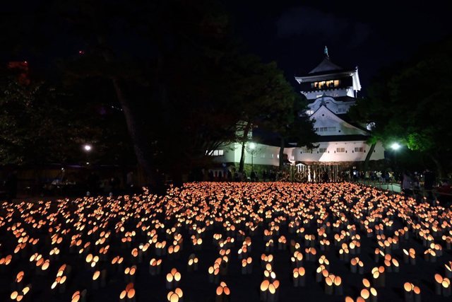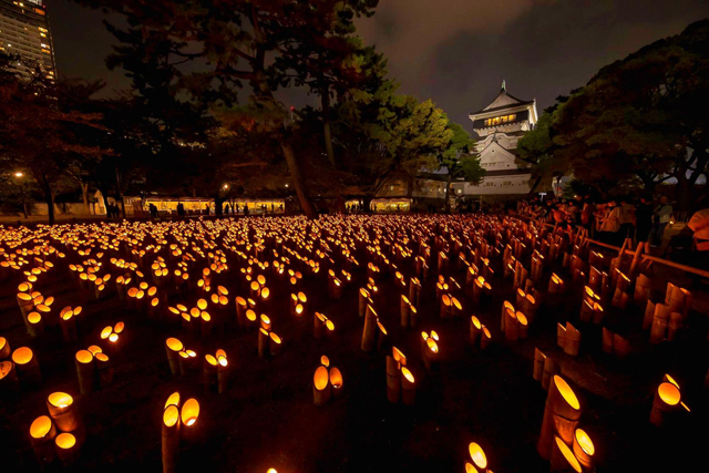 小倉城天守閣広場周辺に灯る3万個の竹あかりにより、荘厳かつ幻想的な光景が楽しめます。期間中は小倉城菊まつりも同時開催。