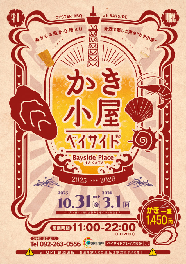 2025年10月31日(金)~2026年3月1日(日)11:00~22:00(L.O 21:30)、ベイサイドプレイス博多(福岡市博多区築港本町13番6号)ベイサイドキャノピー(屋外施設)に「かき小屋 in ベイサイド」がオープン!
