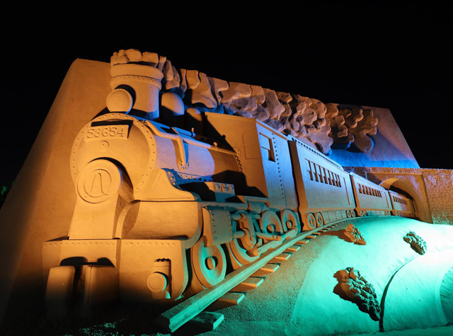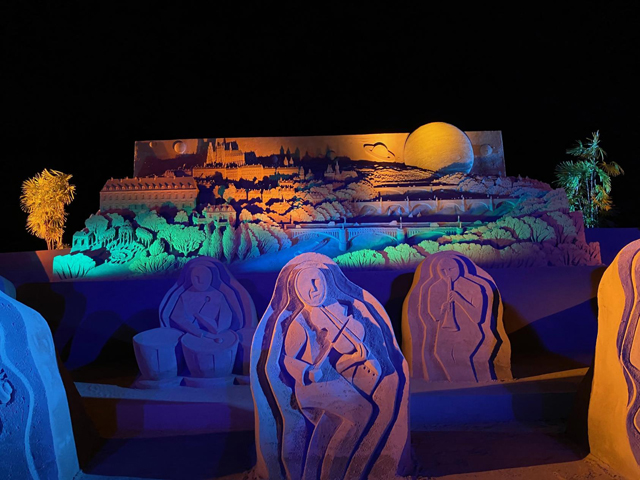 夜にはライトアップも行われ、幻想的な世界観をお楽しみいただけます。昼夜それぞれの砂像を見比べてみるのもおすすめ。