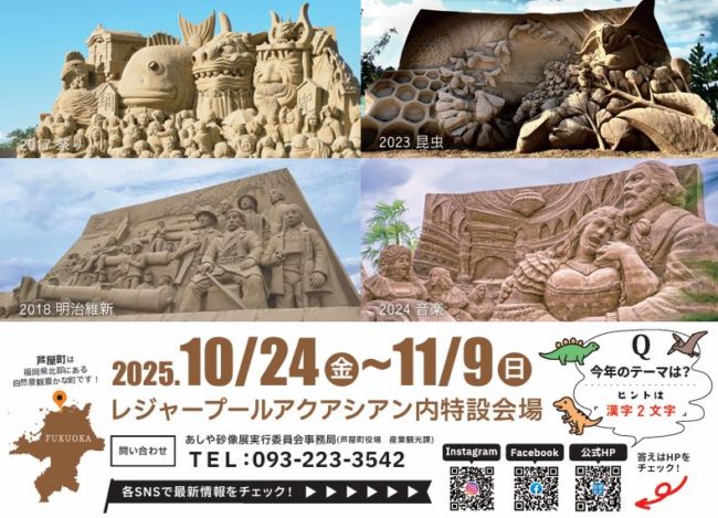 2025年10月24日(金)~11月9日(日)10:00~21:00(入場は20:30まで)、芦屋海浜公園レジャープール「アクアシアン」横特設会場(遠賀郡芦屋町芦屋1455-284)にて「あしや砂像展2025」が開催されます。