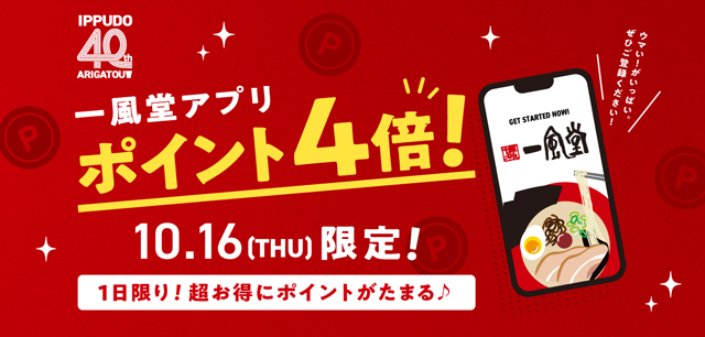 2025 年10月16日(木)の一日限定で、一風堂公式アプリにてポイント4倍キャンペーンを開催。