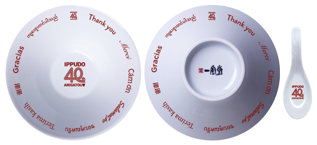 40年間の感謝の気持ちを込め、期間中に国内の一風堂でお食事をされたお客様を対象に、オリジナルデザイン丼と40周年ロゴ入りれんげのセットを抽選で400名にプレゼント。丼のふちには、現在一風堂が展開している世界16カ国・地域の主な言語で「ありがとう」をあしらいました。一風堂店舗で使用しているものと同じ、耐久性に優れた有田焼の丼です。