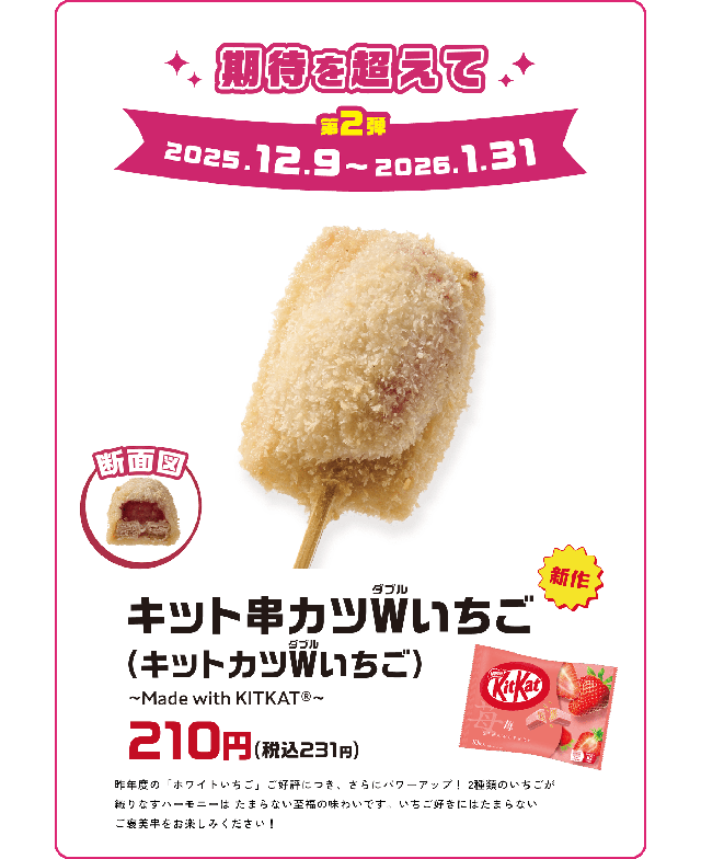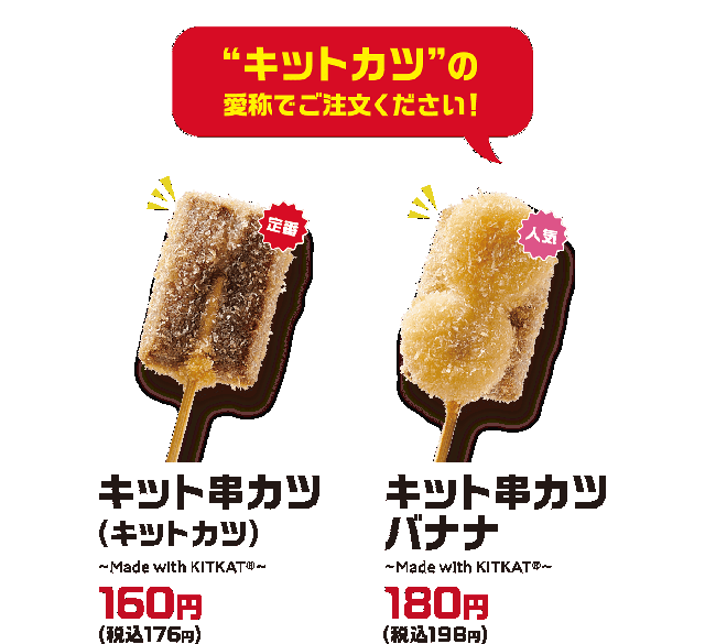 今年も「揚げ(アゲ)て、皆の夢を応援したい!」そのような想いから、3年連続でコラボを実施。定番の「キット串カツ~Made with KITKAT®~」はもちろん、コラボ期間の前半(第1弾)は「期待に応えた」キット串カツ、後半(第2弾)は「期待を超えた」キット串カツが新たに登場。