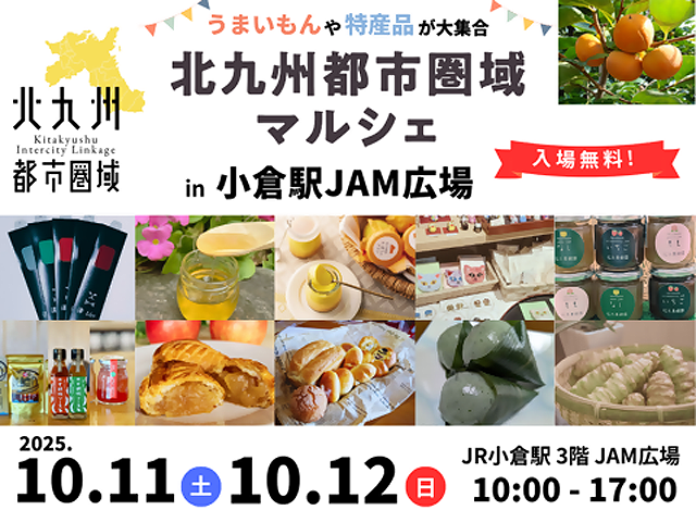 2025年10月11日(土)・10月12日(日)10:00~17:00、JR小倉駅3階 JAM広場(北九州市小倉北区浅野1丁目1番地)にて「北九州都市圏域マルシェ in 小倉駅JAM広場」が開催されます。