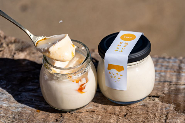 福岡県芦屋町は響灘に面した美しい海の魅力を持つ町。そこで採れる塩をかけて食べるのが特徴の塩ぷりん専門店です。塩との相性を考え厳選素材を使用した自家製のぷりんを主に販売しています。