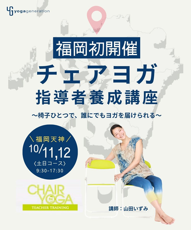 未経験でチェアヨガインストラクターに!「チェアヨガ指導者養成講座」開催。2025年10月11日(土)~10月12日日<土日コース> 9:30~17:30、天神で「チェアヨガ指導者養成講座」が開催されます。
