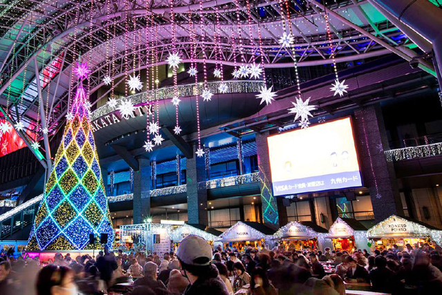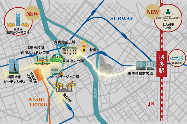 主な会場は、福岡空港、JR博多駅前広場、貴賓館前広場、天神中央公園、福岡市役所西側ふれあい広場、福岡大名ガーデンシティ。博多から中洲を通り、天神までが光の帯となって、さまざまなイルミネーションやクリスマスマーケットが開催されます。
