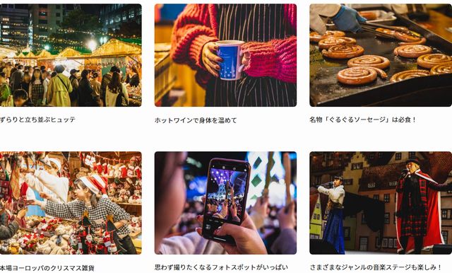 サンタやトナカイなどのクリスマスオーナメントで装飾されたお店が立ち並び、体を温めてくれるグリューワイン(ホットワイン)などグルメも充実。さまざまなツリーや絵本の中に登場しそうな街並みが広がり、写真を撮りたくなるスポットがいっぱいです!ドイツのとある村へ迷い込んだかのような、楽しい気分にさせてくれます。