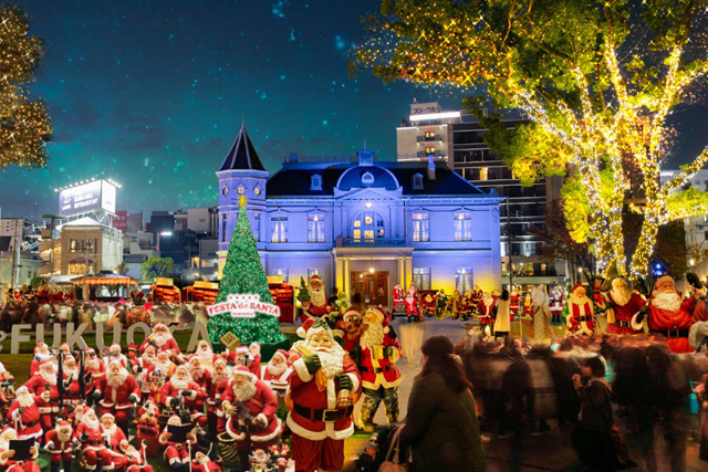 2023年に新しく加わった「KBC FESTA de SANTA」では、幻想的にライトアップされた旧福岡県公会堂貴賓館前に、100体以上の世界のサンタクロース像が⼤集合!⾒上げるほど巨⼤なサンタや小さく愛嬌のあるサンタ、サングラスに半袖姿の南国からきたサンタなどが出迎えてくれます。