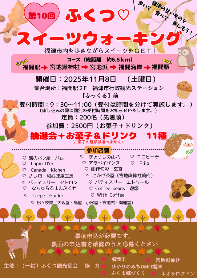2025年11月8日(土)9:30~15:00、福津市各所(宮地嶽神社・宮地浜・福間海岸など)にて「第10回ふくつ♡スイーツウォーキング」が開催されます。