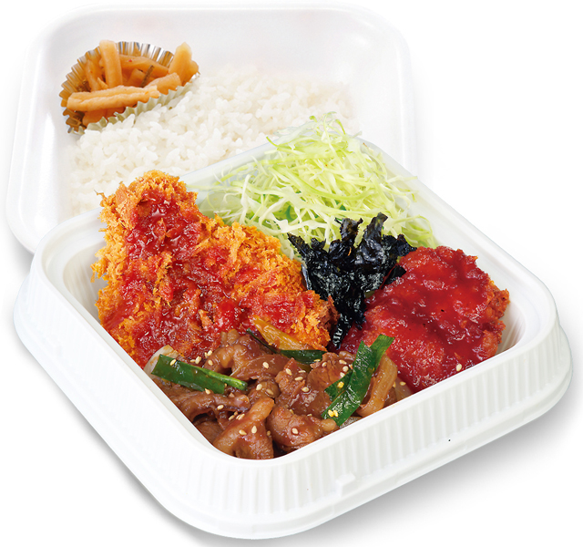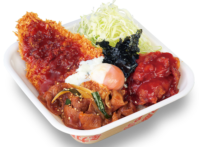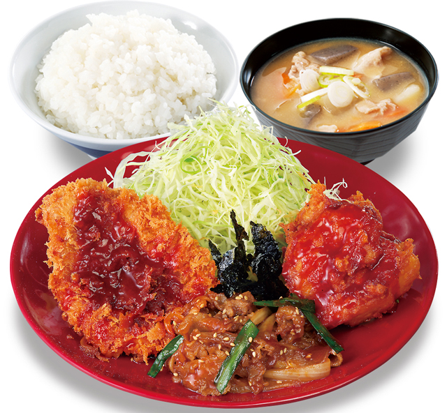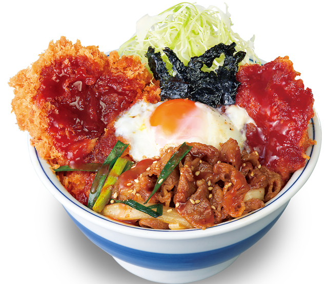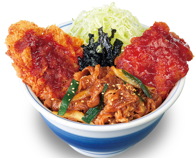 玉ねぎやニラと共に甘辛く仕上げた牛肉の「プルコギ」、ヤンニョムソースで仕立てた「ヤンニョム風鶏から揚げ」、そして、かつやの定番「ロースカツ」にはピリ辛なビビンバソースを合わせました。