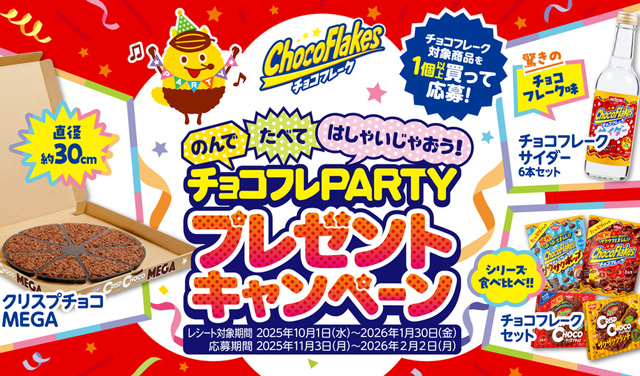 日清シスコ株式会社は、「のんでたべてはしゃいじゃおう! チョコフレPARTYプレゼントキャンペーン」を、2025年11月3日(月)から実施します。
