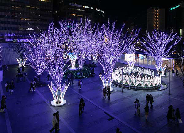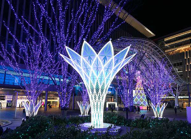 青い光で彩られた博多駅前広場の約30本の樹木は光の街へのプロローグ。街全体を優しい光で包みます。