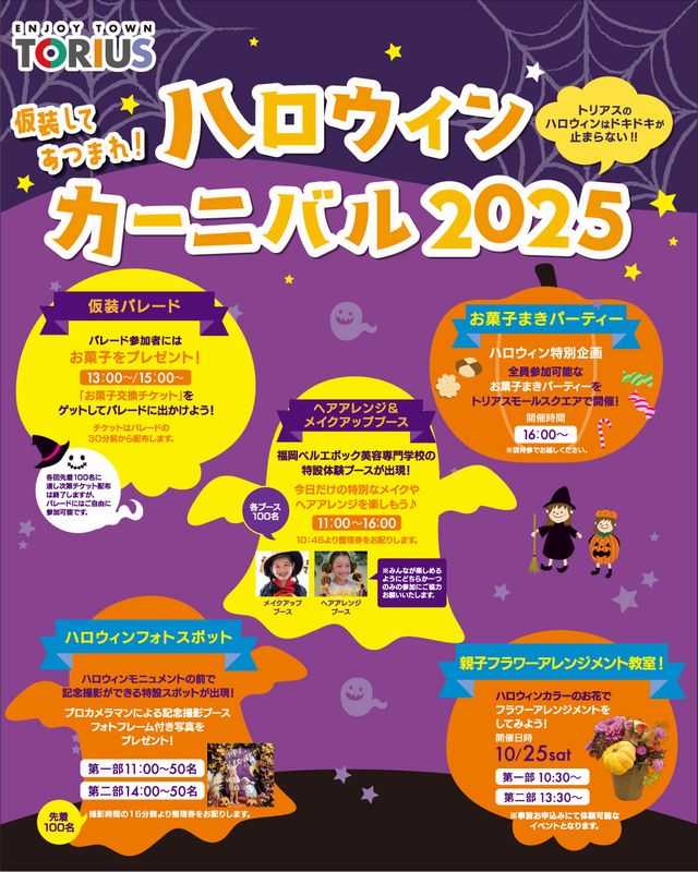 2025年10月26日(日)11:00~16:15、トリアス久山(糟屋郡久山町山田1111)にて「ハロウィンカーニバル2025」が開催されます。