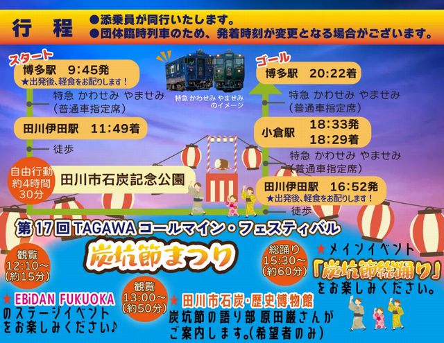 ◆旅行代金に含まれるもの:JR券代、軽食代(昼・夕)、田川市石炭・歴史博物館観覧料