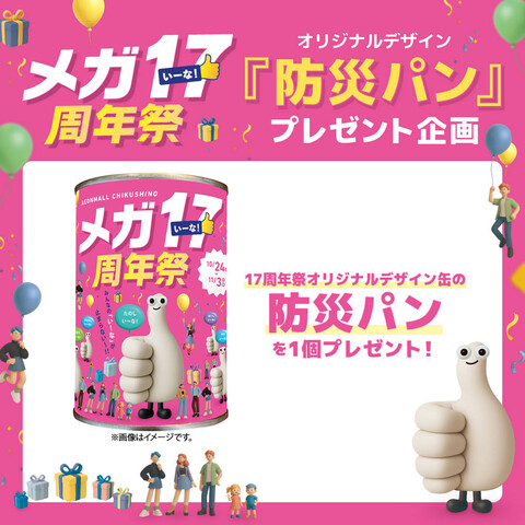 期間:10月24日(金)~11月3日(月・祝)[各日先着170個]イオンモール筑紫野専門店 当日購入レシート5,000円以上(合算可)と、イオンモールアプリクーポンご提示で17周年祭オリジナルデザイン缶の防災パンを1個プレゼント。