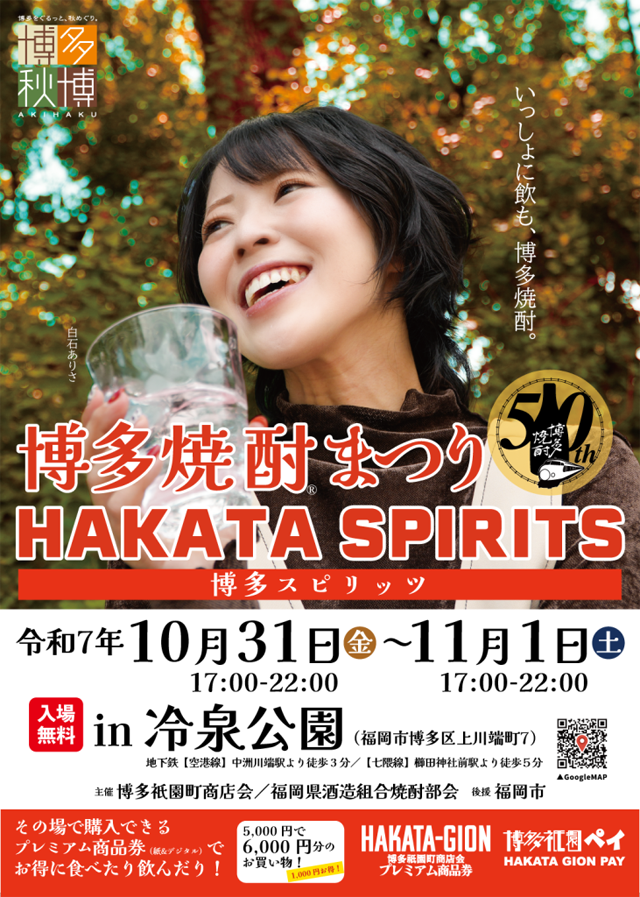 2025年10月31日(金)~11月1日(土)17:00~22:00、冷泉公園(福岡市博多区上川端町7)にて「博多焼酎まつり HAKATA SPIRITS in 冷泉公園」が開催されます。 入場無料。