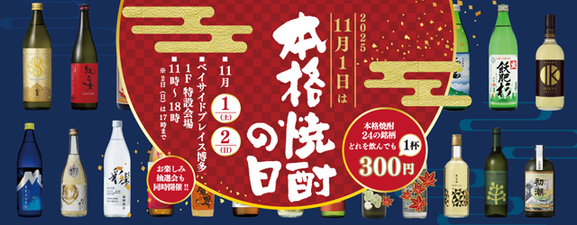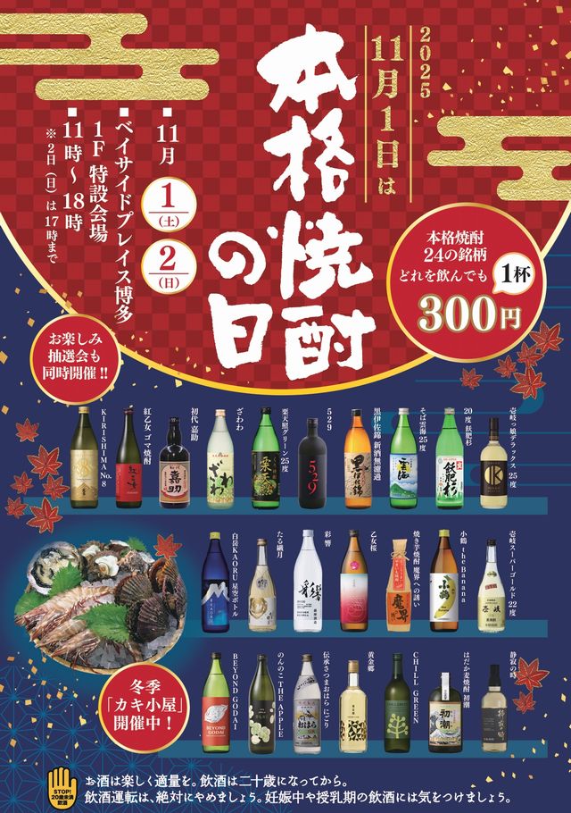 2025年11月1日(土)11:00~18:00、11月2日(日)11:00~17:00、ベイサイドプレイス博多(福岡市博多区築港本町13番6号)ベイサイドキャノピー(屋外施設)に九州の美味い焼酎が集結!