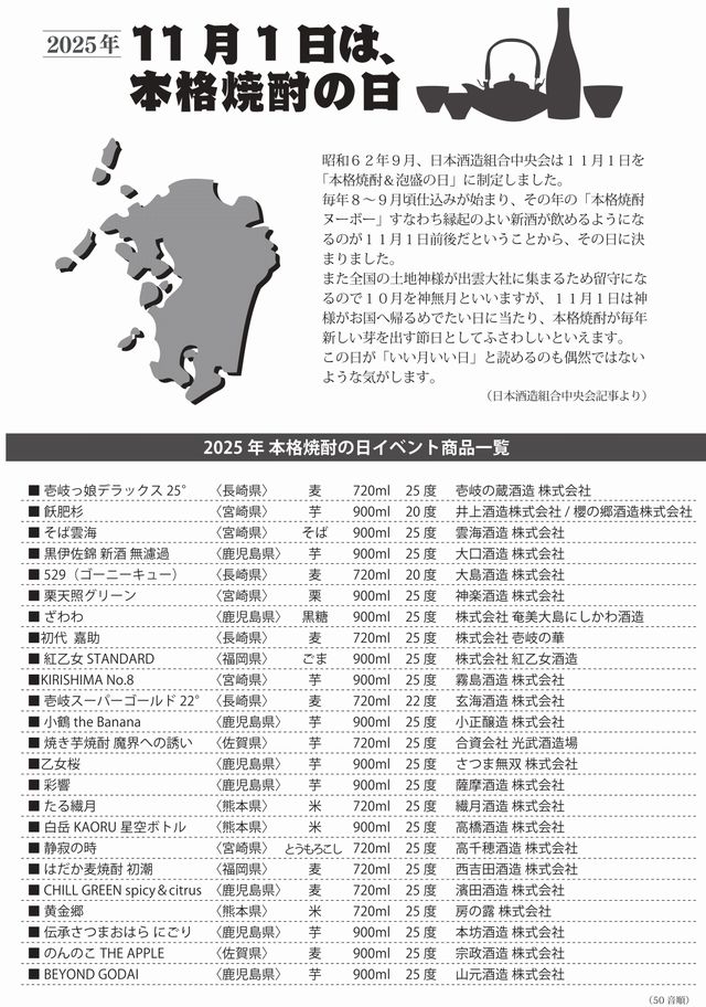 焼酎好きの方必見!11月1日は焼酎の日!本格焼酎24銘柄どれを飲んでも300円。