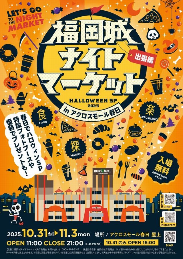 2025年10月31日(金)~2025年11月3日(月・祝)11:00~21:00(31日のみ16:00~21:00)、アクロスモール春日(春日市春日5-17)にて、「福岡城ナイトマーケット in アクロスモール春日」が開催されます。入場無料。