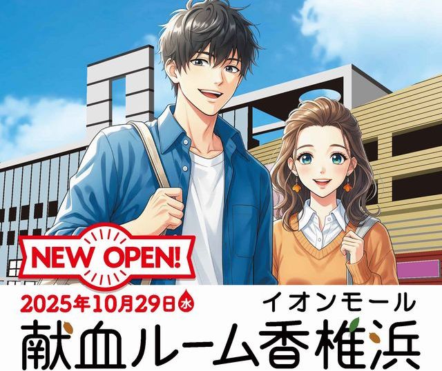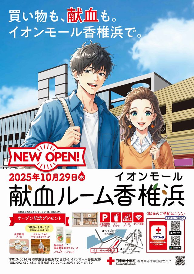 2025年10月29日(水)イオンモール香椎浜(福岡市東区香椎浜)2階に「献血ルーム イオンモール香椎浜」がオープンします。