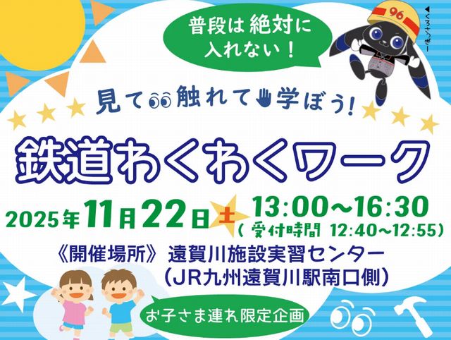 2025年11月22日(土)13時00分~16時30分(受付時間12時40分~12時55分)遠賀川施設実習センターにて「見て触れて学ぼう!鉄道わくわくワーク」が開催されます。