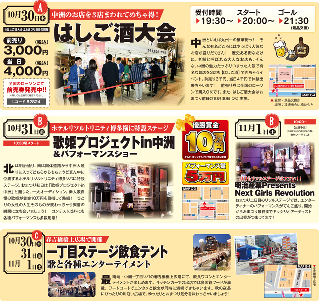 2025年10月30(木)~11月1日(土)中洲地域一帯にて歌姫プロジェクトや女みこしが中洲の街を彩る「第50回 中洲まつり2025」が開催されます。