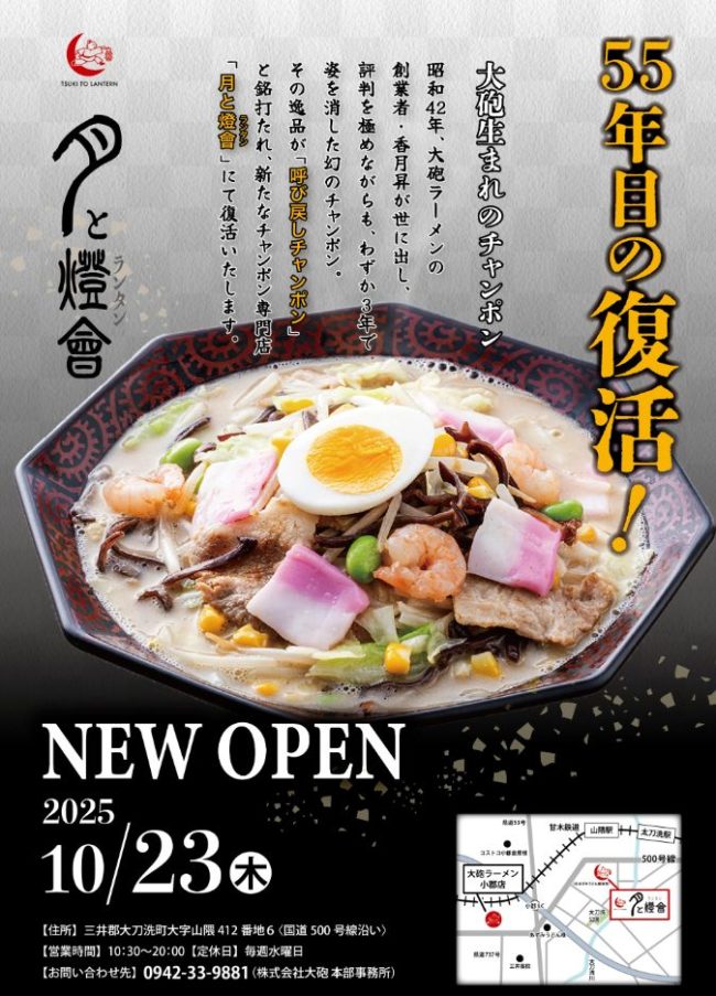 2025年10月23日(木)大砲ラーメンの新業態店舗「呼び戻しチャンポン 月と燈會(ランタン)」(三井郡大刀洗町大字山隈412-6)がオープン。