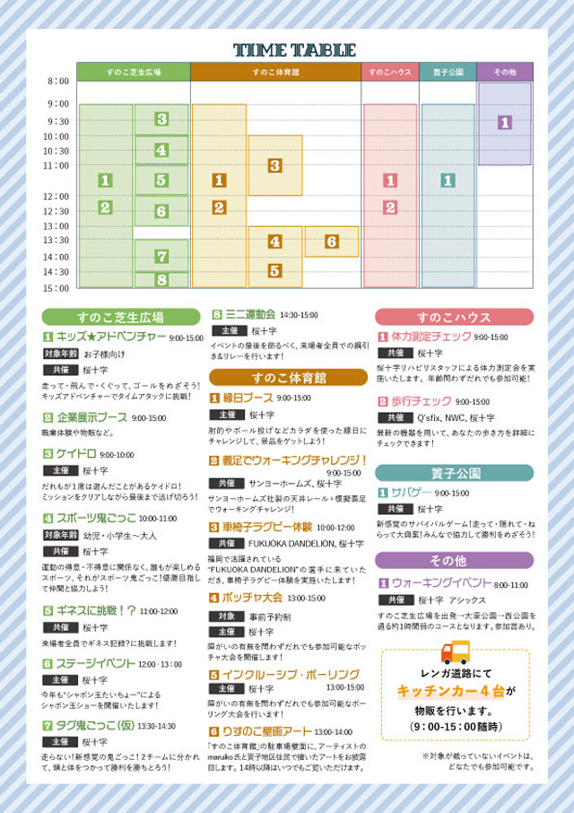 様々なスポーツイベントや健康体験、縁日、展示のほか、アーティストのmaruiko氏と簀子地区住民で「すのこ体育館」の駐車場壁面に描いた「りすのこ壁画アート」のお披露目も行います。