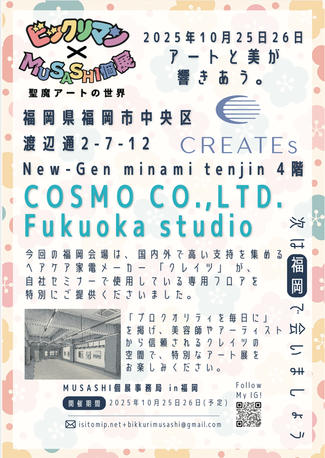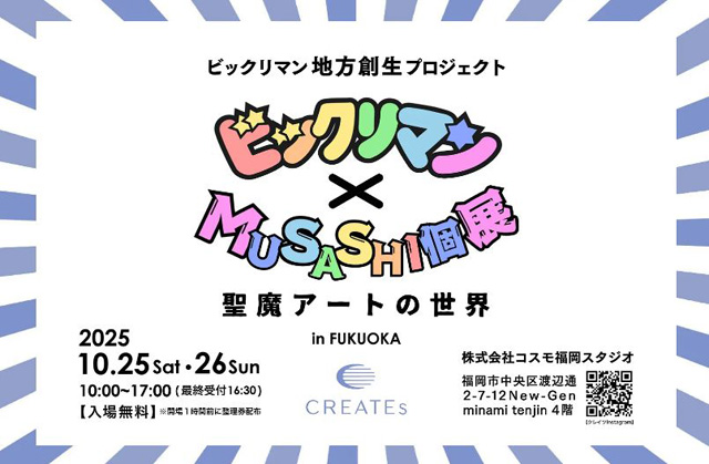 2025年10月25日(土)~10月26日(日)10時~17時(最終受付16時30分)株式会社コスモ福岡スタジオ(福岡市中央区渡辺通2-7-12 New-Gen minami tenjin 4階)にて「ビックリマン×MUSASHI個展~聖魔アートの世界~」第三弾が開催されます。