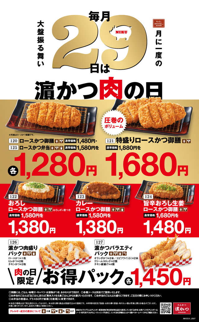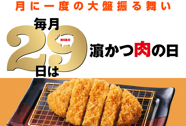 月に1度の大盤振る舞い!毎月29日は濵かつの「肉の日」です。お店で食べる御膳も、持ち帰りの盛り合わせパックやお弁当も、お得な価格で提供。「肉の日」限定の「お得パック」も販売!