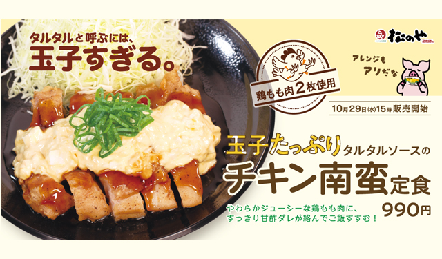 株式会社松屋フーズでは、とんかつ専門店の「松のや」において、2025年10月29日(水)午後3時より、「チキン南蛮定食」を発売します。