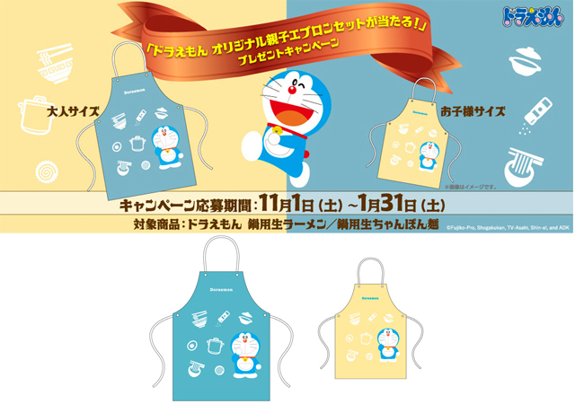 「ドラえもん 鍋用生ラーメン 180g」「ドラえもん 鍋用生ちゃんぽん麺 180g」を1点以上購入した方の中から抽選で500名に、大人サイズとお子さまサイズをセットにした「ドラえもん オリジナル親子エプロンセット」をプレゼント。
